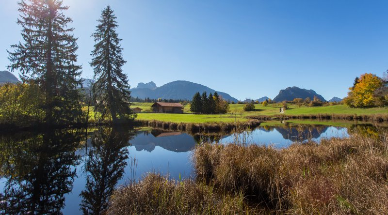 In der unberührten Seenlandschaft rund um Pfronten im Allgäu kommen große und kleine Badefans sowie Wassersportler auf ihre Kosten. Egal ob Bergsee, künstlich angelegt oder Natursee − über zehn Seen liegen in der Region im Voralpenland und bieten sich als Ziele für eine Radtour oder Wanderung an. So erreichen Wasserratten und Angler beispielsweise von Pfronten in nur wenigen Minuten mit dem Fahrrad den Kögelweiher. An dem Moorsee entspannen sie umgeben von dichten Wäldern auf einer Liegewiese. Zum Angeln, Tretbootfahren oder Stand Up Paddling eignet sich der Weißensee mit großer Liegefläche vor allem auch für Familien. Direkt oberhalb des Weißensees erwartet Badegäste kristallklares Wasser und einen Blick auf die Alpen am Alatsee. Der See, der zu den saubersten Seen Deutschlands gehört, kann bei einem leichten Spaziergang bequem umrundet werden. Ein Kneippbecken und zwei Liegewiesen sorgen darüber hinaus für Entspannung und Sonnenbaden. Auch der bekannte Forggensee befindet sich ganz in der Nähe. Der Stausee ist der fünft größte See in Bayern und bietet mehrere Badestellen sowie zahlreiche Wassersportaktivitäten wie etwa Segeln, Surfen oder die Forggensee-Schifffahrt und auch ein Radweg führt rund um den See. Als Abwechslung zum See, Weiher und Co. verspricht das Alpenbad Pfronten zu jeder Jahreszeit Wasserspaß. In einer der schönsten Freibadanlagen des Allgäus direkt am Hang gelegen plantschen Besucher im Indoor- oder Outdoorbereich in mehreren Wasserbecken. So genießen die Großen beispielsweise auf der Liegewiese das Bergpanorama während im Spaßbereich die Kleinen auf der Großwasserrutsche oder in der Felsengrotte mit Kaltwasserfall toben.