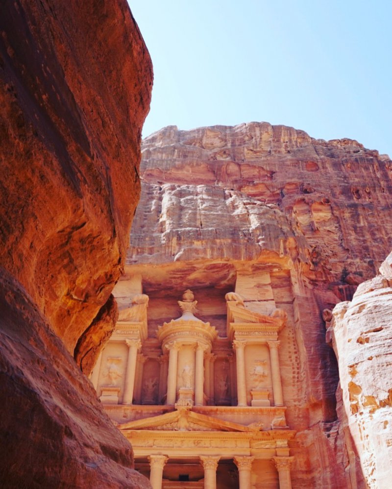 Das ist Pflicht: Ein Besuch in der antiken Felsenstadt Petra. In der Antike war sie Hauptstadt des Reiches der Nabatäer, heute zählt sie zu den sieben neuen Weltwundern. Schon der Weg dorthin ist umwerfend: Zunächst geht es durch eine Schlucht, deren Wände bis zu hundert Meter empor ragen. Hier jagt bereits ein Fotomotiv das nächste. Am bekanntesten ist am Ende dieser Schlucht wohl das Schatzhaus von Petra, dessen Bild zahlreiche Jordanien-Reiseführer ziert und sogar Schauplatz einer Indiana Jones Verfilmung war. Beeindruckend sind aber auch die Felsengräber oder das römische Amphitheater.