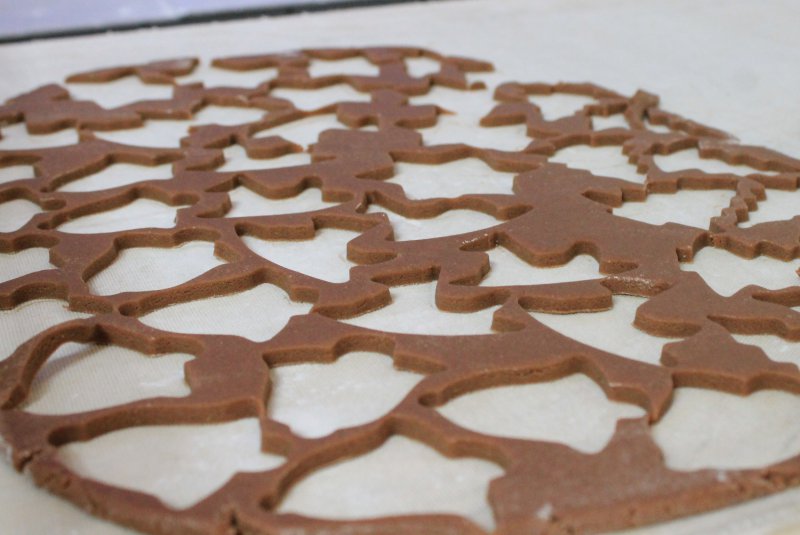 Den Teig auf bemehlten Fläche ausrollen (ca. ½ cm dick) und mit Formen die gewünschten Motive ausstechen. Bleche mit Backpapier auslegen und Lebkuchenplätzchen im vorgeheizten Backofen bei 180 Grad (Umluft 160 Grad) 12-15 Minuten backen.