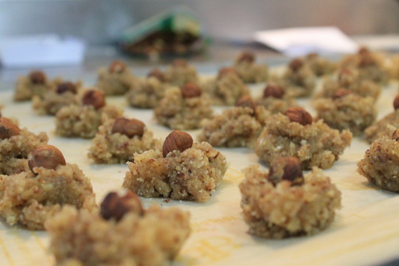 Nun mit zwei Teelöffeln kleine, unordentliche Häufchen auf das Backblech mit Backpapier. Anschließend auf jedem Ottole noch eine Haselnuss stecken und dann für ca. 20 Minuten bei 150 Grad backen.