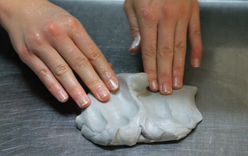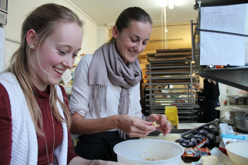Den Teig in zwei gleiche Stücke teilen und daraus zwei Stangen von je 30 cm Länge rollen. Auf eine mit Mehl bestäubte Unterlage legen und etwas flach drücken. 2 - 3 Stunden oder über Nacht im Kühlschrank fest werden lassen.