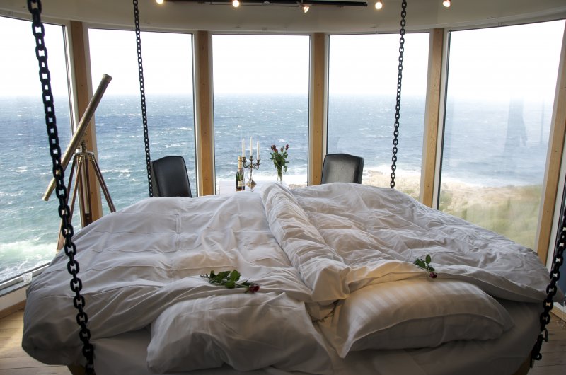 Am äußersten Zipfel des Naturreservats Kullaberg in Schonen, auf einer schroffen Bergkuppe 70 Meter über dem Meer, thront der Leuchtturm „Kullens fyr“. Im direkt danebenliegenden historischen Beobachtungsposten „Falknästet“ ist der perfekte Platz für die magischen vier Worte. Verliebte nächtigen in einem runden, an der Decke befestigten Bett mit fantastischem Panoramablick auf das Meer und die felsige Steilküste. Hier stören kein Zimmerservice und kein WLAN die traute Zweisamkeit, denn das Hotel verfügt lediglich über ein einziges Zimmer und kommt ohne Rezeption und Personal aus. Dafür ist die Minibar gut gefüllt und ein reichhaltiges Frühstücksbuffet erwartet das frisch verlobte Paar nach einem kurzen Spaziergang im vier Kilometer entfernten Grand Hotel in Mölle.