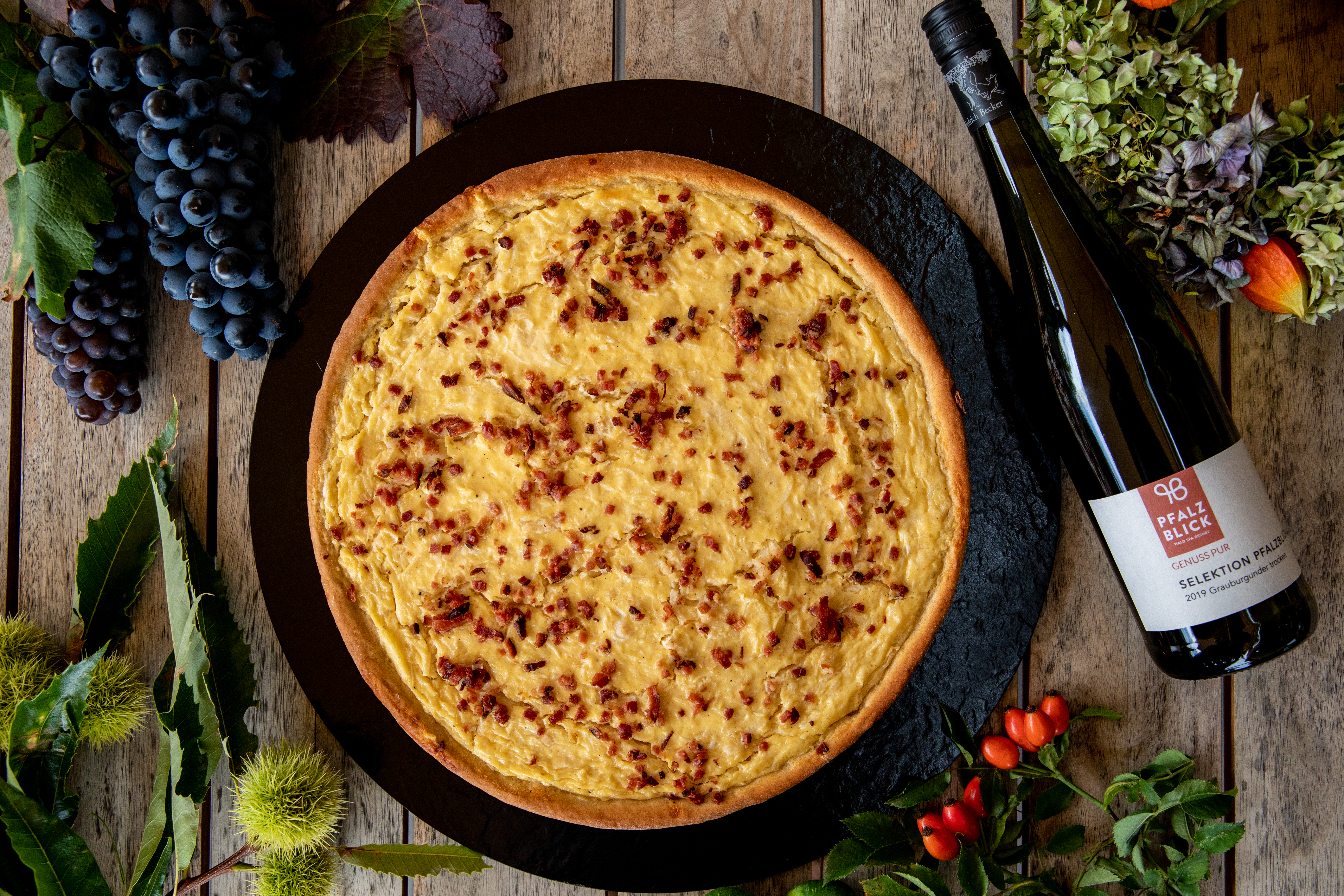 Im Pfalzblick Wald Spa Resort genießen Gäste nicht nur den Blick auf das herbstlich, goldene Panorama von den Balkonen der gemütlichen Zimmer, sondern auch die Aussichten auf die Inklusivleistungen und das facettenreiche Aktivitäten- und Erholungsangebot. Das Sport- und Vitalprogramm wird je nach Kurs im 55.000 Quadratmeter großen Gartenparadies oder im eigens dafür gedachten Gymnastikraum angeboten. Die Erkundung der Umgebung ist zu Fuß oder auf dem Fahrrad auf zahlreichen Premiumthemenwegen möglich. Neben Burgruinen und faszinierenden Felsen ist die lediglich 25 Kilometer vom Hotel entfernte Südliche Weinstraße ein weiteres spannendes Kulturgut. Die Spitzenweine aus der Pfalz und dem Elsass begleiten auch die regionalen Köstlichkeiten des Hotelrestaurants, darunter Fisch- und Fleisch sowie vegetarische und vegane Spezialitäten. Ebenfalls zum Einsatz kommt die edle Traube beziehungsweise ihr hochkonzentrierter Wirkstoff im Wald Spa: Hier werden unter anderem erlesene Produkte von Vinoble für wohltuende Behandlungen verwendet.