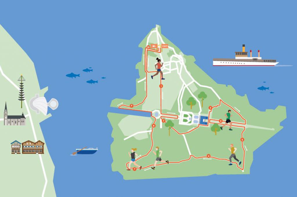 Copyrights: Herreninsel © Prien Marketing GmbH, Tanja Ghirardini. Strecke Herrenchiemsee-Lauf ©München Marathon GmbH. Ortskern Prien am Chiemsee © Prien Marketing GmbH, Tanja Ghirardini.