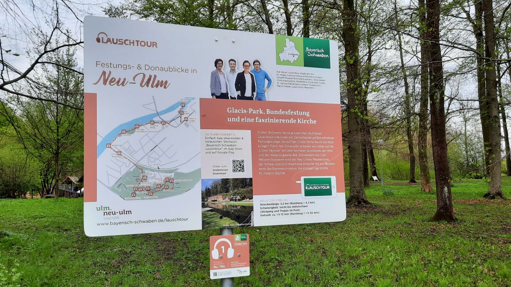 Eine Stunde und 15 Minuten dauert die neue Tour „Festungs- und Donaublicke in Neu-Ulm“. Der in der Lauschtour beschriebene Weg führt gut drei Kilometer von der Schießhausallee über den Glacis Park zum Wasserturm. An der Donau entlang geht es über den Schwal (eine Donauinsel) zur einzigartigen Kirche St. Johann Baptist, ein Meisterwerk des Expressionismus, und wieder zurück zum Glacis Park.