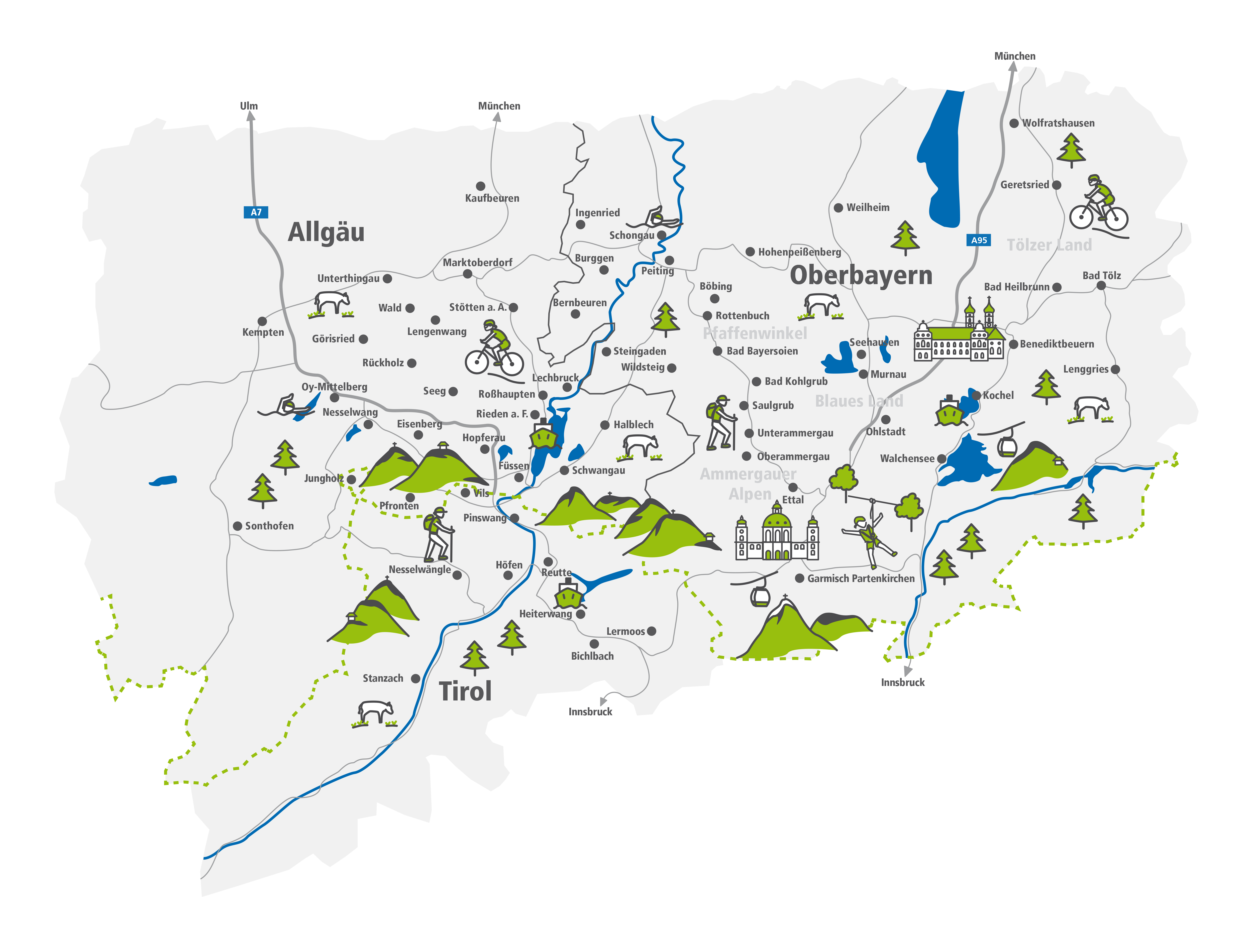 Dank klimafreundlicher Mobilitätskonzepte nutzen Gäste mit der KÖNIGSCARD seit diesem Jahr in einigen Regionen Elektrofahrzeuge für einen begrenzten Zeitraum kostenfrei. Dadurch erhalten sie die Möglichkeit, autofrei anzureisen und dennoch bequem vom Bahnhof zur Unterkunft zu gelangen oder während ihres Aufenthalts umweltschonend voranzukommen. Ergänzend dazu wird auch seit Jahresbeginn das regionsübergreifende Gratis-ÖPNV-Angebot der KÖNIGSCARD sukzessive erweitert. So können KÖNIGSCARD Urlauber das vorhandene Streckennetz beispielsweise durchgängig vom Allgäu in die oberbayerischen Regionen Blaues Land und Ammergauer Alpen nutzen.Tölzer Land Teil der KÖNIGSCARD