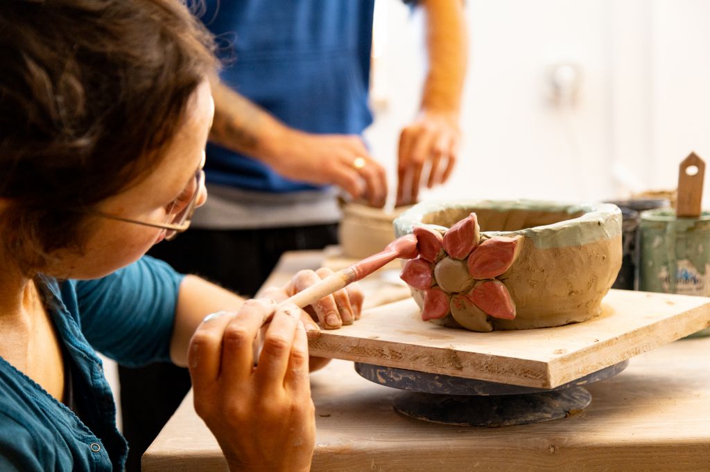 Den Kopf freibekommen, indem die Hände beschäftigt sind – für viele ist das die beste Form der Auszeit. Volle Konzentration auf etwas anderes, etwas Ungewohntes, das unsere ganze Aufmerksamkeit benötigt und schon kreisen die Gedanken nicht mehr um die eigenen Probleme. Nicht nur deshalb sind Kreativ-Workshops so beliebt. Zusätzlich lernt man beim Töpfern, Malen oder Glasblasen auch neue Fertigkeiten. Wer beim Selbermachen am besten abschalten kann, findet in Pfronten gleich mehrere Angebote, um die eigenen Hände sprechen zu lassen. Im Workshop von Keramikerin Judith Lomba wird geknetet, geformt und geglättet, bis aus dem feuchten Ton eine Tasse, Schale oder Skulptur entstanden ist. Die Pfrontener Künstlerin Anette Nöß bietet Mal-Workshops an. Gemeinsam geht es mit intensiven Farbpigmenten, Naturmaterialien, Pinseln und Spachteln hinaus in die Natur zum „Malen am Baum“. In den Workshops von Glasbläser Alexander Endres formen die Teilnehmenden aus flüssigem Glas ihre eigenen Glasperlen. Und in der Werkstatt von Markus Nöß können Interessierte sogar ihre eigenen Haferlschuhe herstellen.