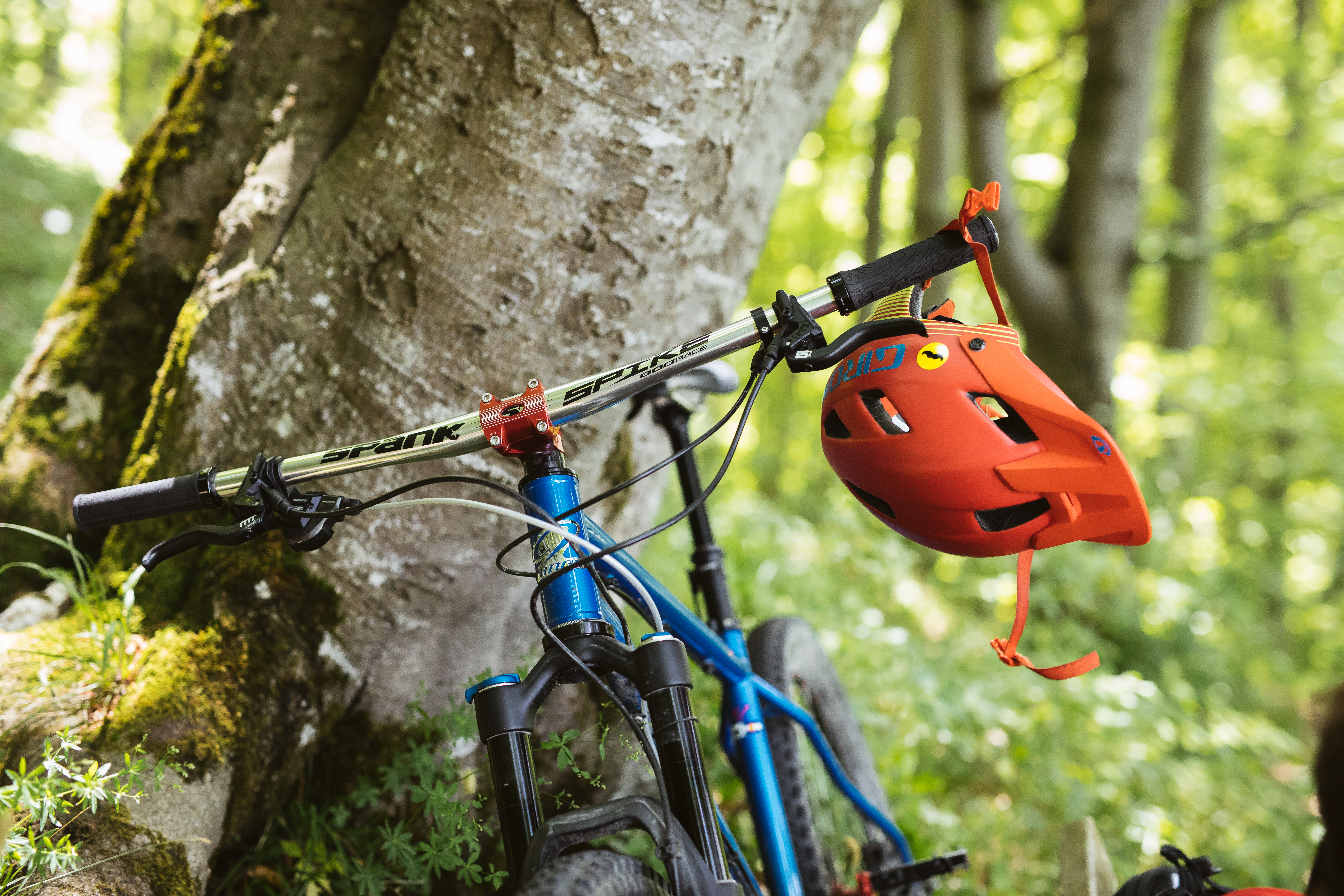 Bevor es überhaupt losgeht, muss geprüft werden, ob alles richtig sitzt. Ich lasse den Kopf samt Helm nach unten hängen – ohne diesen zu schließen. Ganz schön mutig. Und zu meinem Erstaunen: Der Helm hält. Trainer Philipp ist zufrieden. „Genau so soll es sein. Ist der Helm geschlossen, sollte zwischen Kinn und Riemen maximal ein Finger reinpassen und die Dreiecke müssen sich schön um die Ohren legen. Dann sitzt der Helm richtig.“ Danach begutachten wir noch die Reifenprofile, testen den Lenker auf seine Stabilität hin (denn ist der nicht fest, kann das im Gelände böse Folgen haben), stellen den Sattel ein und schwingen uns aufs Rad. Doch wer jetzt gleich eine rasante Downhill-Fahrt erwartet hat, wird enttäuscht sein. Damit wir ein erstes Gefühl für das Bike bekommen, werden ein paar Koordinationsspielchen gemacht. Kreuz und quer fahren beziehungsweise rollen wir in „Slow Motion“-Manier auf dem Rasen herum, klatschen ab und zu ein, berühren uns mit Ellbogen oder den Füßen. Aber bei gleichzeitigem Balancieren und Kopfrechnen wird’s dann langsam wirklich kompliziert. „Mir geht es vor allem darum, dass man auf dem Rad ist und lernt, dabei noch etwas anderes zu tun oder zu denken, denn beim Biken draußen muss man sich auch für jede Kurve und für jedes Hindernis eine eigene Strategie zurechtlegen“, erklärt der Profi. 2012 hat Philipp nach dem Studium ALBBIKE gegründet und bietet mittlerweile mit insgesamt sechs anderen Jungs verschiedene Mountainbike Technikkurse und Touren auf der Schwäbischen Alb an.
