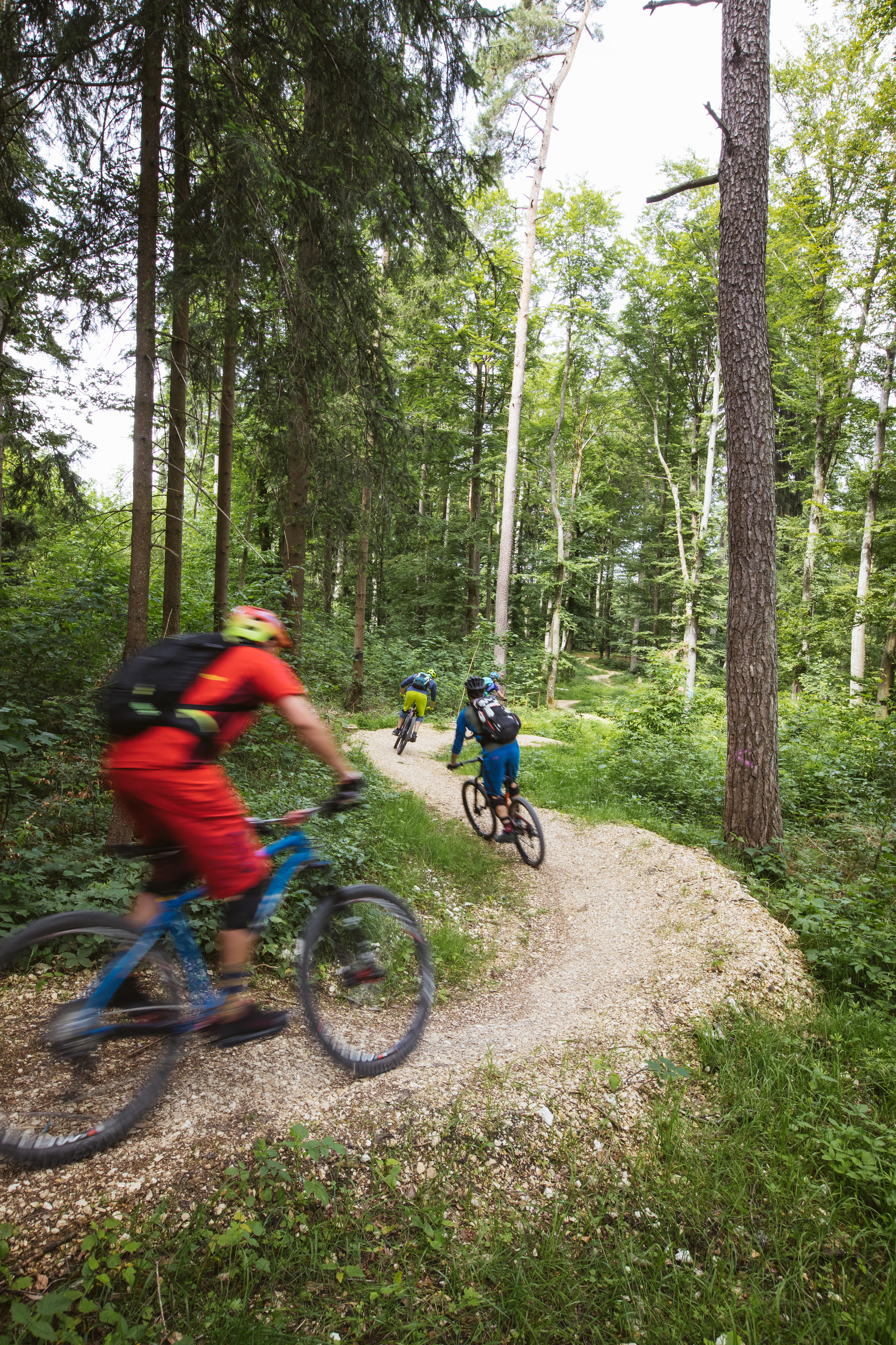 Wie echte Profis stehen wir oben auf dem kleinen Hügel und warten auf das Signal. Wir dürfen erst losfahren, wenn die Hand nach oben geht. Dann heißt es rollen lassen bis wir auf gleicher Höhe mit Phillipp sind, um schließlich auf Schrittgeschwindigkeit runterzubremsen. Am Anfang ruckelt es noch, aber mit der Zeit bekommen wir ein Gespür für die Bremskraft. Wobei man beim Hinterrad eher von einer Art Korrekturfunktion, als einer echten Bremswirkung sprechen muss. Und dann ist es soweit: Andächtig und auch schon etwas außer Puste schieben wir bergaufwärts. Unter uns ein paar Wurzeln und eine kleine Kurve in den Wald. Ein schöneres Trainingsgelände kann man sich gar nicht wünschen. Noch etwas zaghaft und dann doch schneller als gedacht, fahren wir hinab. Schnurstracks über die Wurzeln. Geschafft haben wir sie – aber ein lastfreier Lenker war das bestimmt nicht. Vor allem beim Bremsen verlagert sich der Schwerpunkt ruckartiger als erwartet und man kommt aus dem Gleichgewicht. In der Praxis auf dem Trail ist es dann eben doch etwas anders. „Das passiert vielen Bikern. Weshalb die meisten dann einfach über die Hindernisse drüber brettern statt sie kontrolliert abzufahren“, erklärt Trainer Phillipp. Nach ein paar Tipps und aufmunternden Worten probieren wir es gleich noch einmal. Und siehe da. Klappt schon viel besser, weshalb wir jetzt auch eine längere Strecke abfahren dürfen. Am Anfang läuft es noch etwas holprig, aber der Tipp einfach dorthin zu schauen, wo man hin will und nicht dorthin, wo der Abgrund ist, hat viel geholfen. So allmählich kommen wir uns schon wie die Weltcupsieger auf der Strecke im Bullentäle vor.