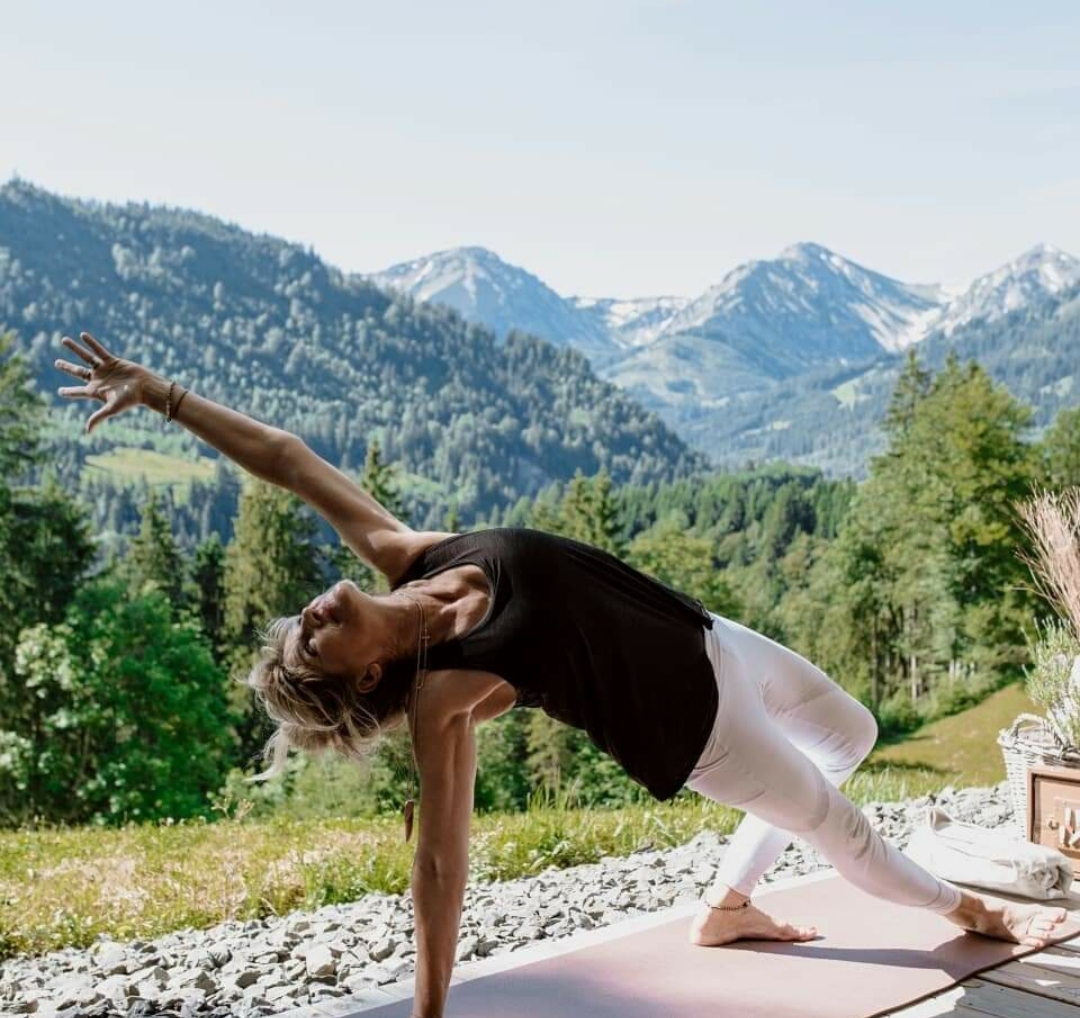 Aufgewachsen in Pfronten verbindet Renate Heckel eine tiefe Heimatliebe und einen besonderen Bezug zur Natur und Allgäuer Bergwelt. Eine weitere große Leidenschaft fand die passionierte Pfrontnerin im Yoga. „Die philosophischen Lehren in Kombination mit den Bewegungen bedeutet für mich physisch und mental gesund zu bleiben und dabei die tiefe Verbundenheit mit der Natur zu spüren“, so Renate. Seit 2014 unterrichtet die ausgebildete Yoga-Lehrerin in der Gemeinde im Ostallgäu. In ihren Übungsstunden vereint sie verschiedene Lehransätze mit der Fünf-Elementen-Lehre und das am liebsten in der unberührten Voralpenlandschaft. So übt Renate beispielsweise im Einklang mit dem Element Wasser an der Vils oder im mystischen Pfrontener Moos. Zu ihren weiteren Lieblingsspots für eine Yoga-Session gehören Deutschlands höchst gelegene Ruine und gleichzeitiger Kraftort - die Burgruine Falkenstein - und der 1.839 Meter hohe Breitenberg. „Am Berg ist die Luft am besten und die Aussicht öffnet den Geist und berührt die Seele“, beschreibt sie. Auf dem Gipfel des Hausbergs gleich neben der Ostlerhütte befinden sich eigens für Yogis errichtete Holzplateaus mit Blick auf den markanten Aggenstein und die Allgäuer Alpen. Von Übungseinheiten bei Kuhglockengeläut zum Sonnenuntergang über Sonnengrüße bei Morgentau in der Früh bis zu Retreats mit Mondlicht-Yoga und Hüttenübernachtung in den Ostlersuites: Renate Heckel richtet Praktiken des „Fließenden Vinyasa Yoga“ und Moonyoga mit Anteilen von Kundalini nach den Mondphasen und Jahreszeiten aus.