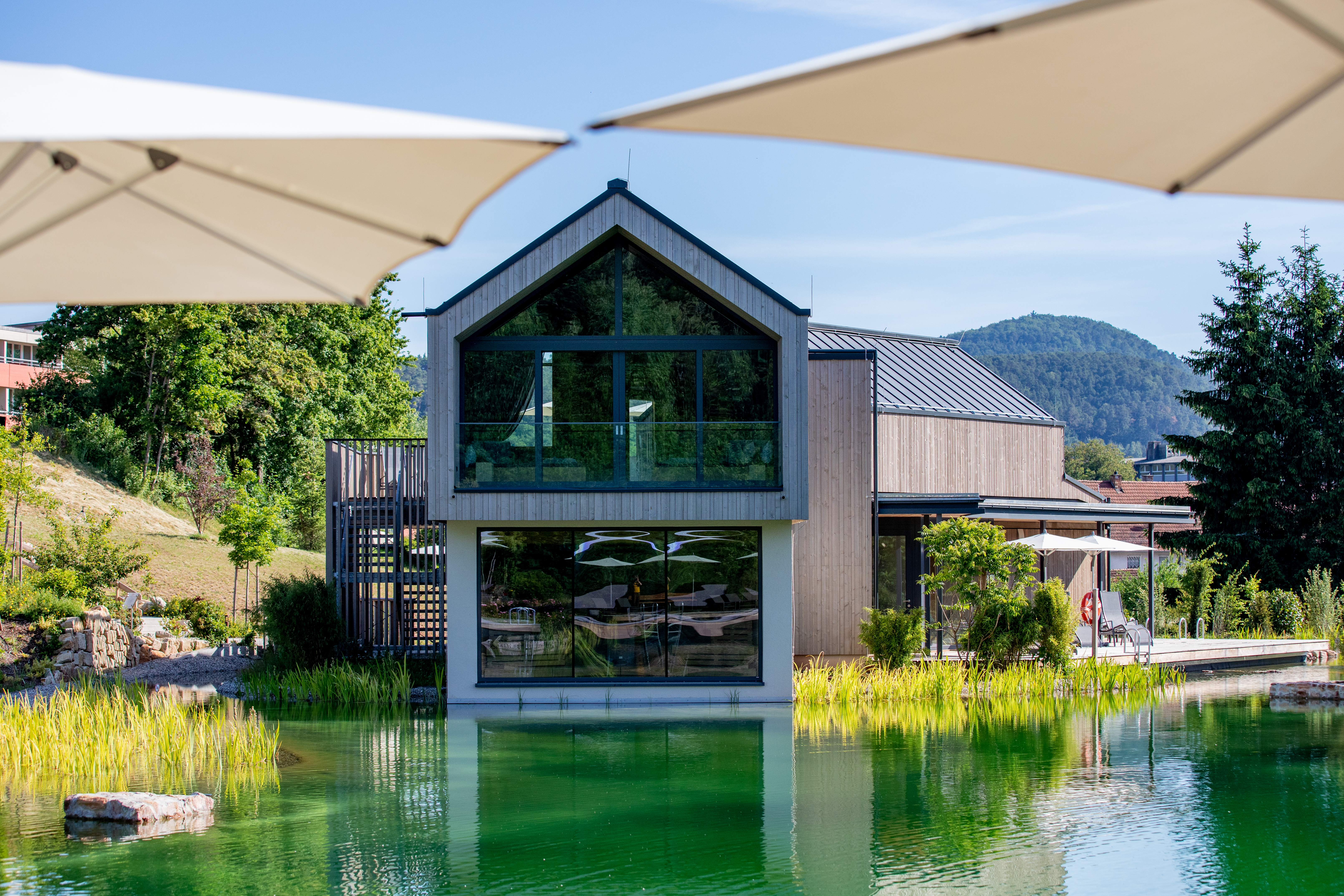 Im neuen Panoramahaus des PFALZBLICK lassen Hotelgäste auf zwei Ebenen sowohl in Relaxzonen als auch im Outdoor-Infinitypool die Seele baumeln. Dabei genießen sie den Talblick auf den 70 Meter langen Naturbadeteich "Kleiner Wasgausee" mit Saunainsel im hoteleigenen 55.000 Quadratmeter großen Gartenparadies sowie auf die Lämmerfelsen in der umliegenden Waldlandschaft. Komfortable Sitz- und Liegemöglichkeiten, gemütliche Doppelliegen in den Nischen sowie freistehende Einzelliegen und neue Wasserbetten erwarten sie in der Galerie. Von dort aus gelangen die Urlauber über einen inneren Einstieg zum neuen, beheizten Outdoor-Infinitypool mit zahlreichen Sprudelattraktionen und über eine Treppe oder mit dem Aufzug zum Saunahaus. Weitere, terrassenförmig angelegte Liegeflächen bieten zusätzliche Rückzugsorte im Grünen. Ebenfalls sorgt die Erweiterung des Restaurants „Wieslauterstube“ über dem Panoramahaus sowie die Vergrößerung der Panoramaterrasse für mehr Freiraum.