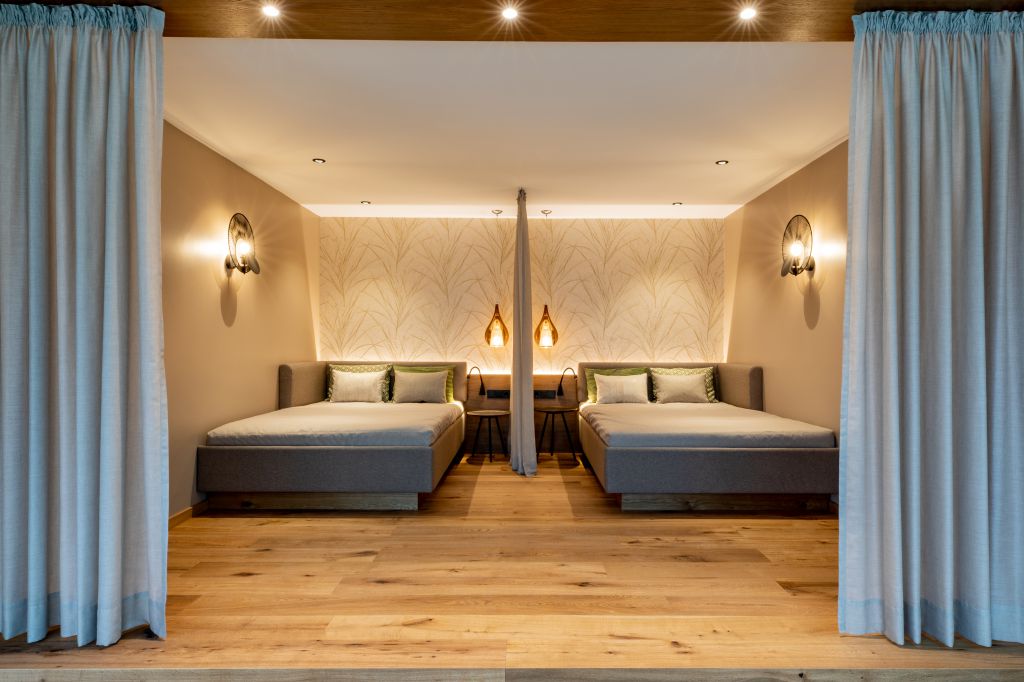 Neben der bereits bestehenden Wellness-Vitalwelt mit Indoor-Pool, Panorama-Whirlpool, Ruhezonen und Badebistro verbringen Erholungssuchende zukünftig ihre Auszeit in einer neuen, privaten Kuschelecke. Auf gemütlichen, durch Vorhänge abgetrennten Betten mit weichen Kissen kommen Gäste zwischen entspannenden Saunagängen und wohltuenden Spa-Behandlungen zur Ruhe. Der Ausblick ins Tal und auf die unberührte Natur des Pfälzerwaldes lädt dabei zum Träumen ein.
