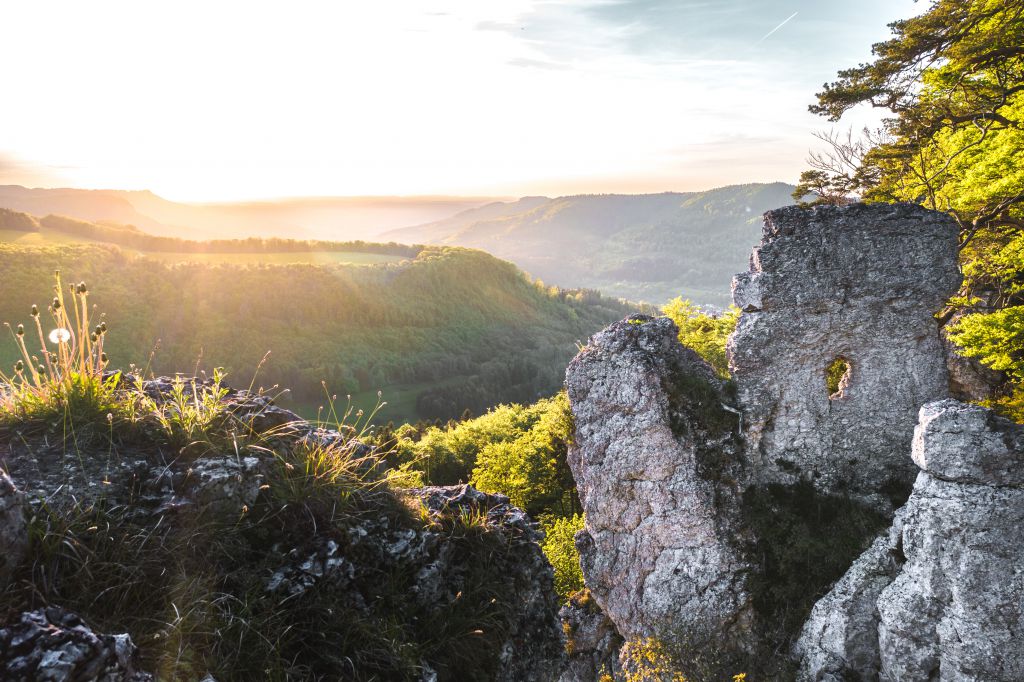 Der Torfelsen bei Meßstetten zählt zu den spektakulärsten Naturformationen am Albtrauf. Ein markantes Felsloch eröffnet den Blick weit ins so genannte Eyachtal und über die Höhenzüge der Alb – ein Motiv, das wie ein natürlicher Bilderrahmen wirkt. Besonders reizvoll sind die wechselnden Lichtstimmungen am Morgen oder Abend, wenn das Tal in sanfte Farben getaucht ist. Die rund dreistündige Tour ist gut markiert und eignet sich für wandererfahrene Familien ebenso wie für ambitionierte Naturfotografen und für Mountainbiker.4. Küchenfels – Naturbühne mit Tiefblick