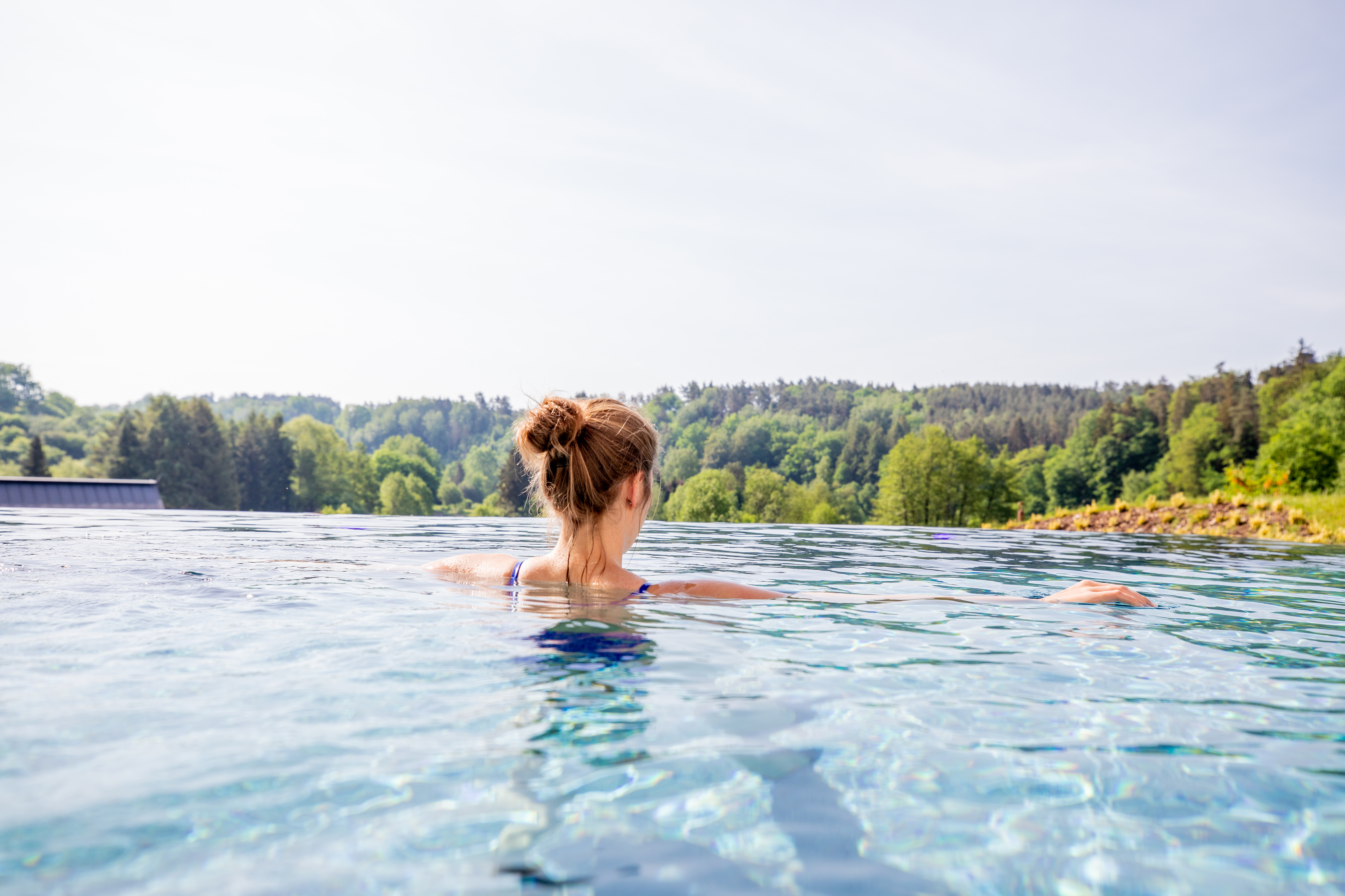 Das familiengeführte Pfalzblick Wald Spa Resort erwartet Gäste mit abwechslungsreichen Wasser- und Saunawelten. Im Innenbereich genießen sie das warme Wasser des Indoor-Pools und Whirlpools, während im Panoramahaus der ganzjährig beheizte Outdoor-Infinity Pool „Sprudelwoog“ mit Sprudelattraktionen und Lichtspielen begeistert. Eingebettet im Gartenparadies und mit Blick auf das Dahner Felsenland schwitzen Gäste in den drei Erlebnissaunen der Outdoor-Saunainsel. Eine finnische Panorama-Sauna verwöhnt mit stimmungsvoller Musik und im Sanarium und der Waldsauna entspannen Erholungssuchende bei sanftem Vogelgezwitscher und dem Farbenspiel des Kristalllichts. Zusätzlich sorgt eine elegante Dampfgrotte für erholsame Momente. Ob zwischen den Saunagängen oder beim Sonnenbaden auf der Seeterrasse – im Winter wie auch im Sommer sorgt der 70 Meter lange Naturbadeteich „Kleiner Wasgau-See“ für Abkühlung und Wasserspaß. Spa-Suiten mit eigenen Saunen, Kaminen und Whirlpools, weiträumige Relaxzonen mit Wasserliegen, Daybeds und Hängeschaukeln sowie ein großes Angebot an Mental-Wellness-Programmen runden das Angebot ab.