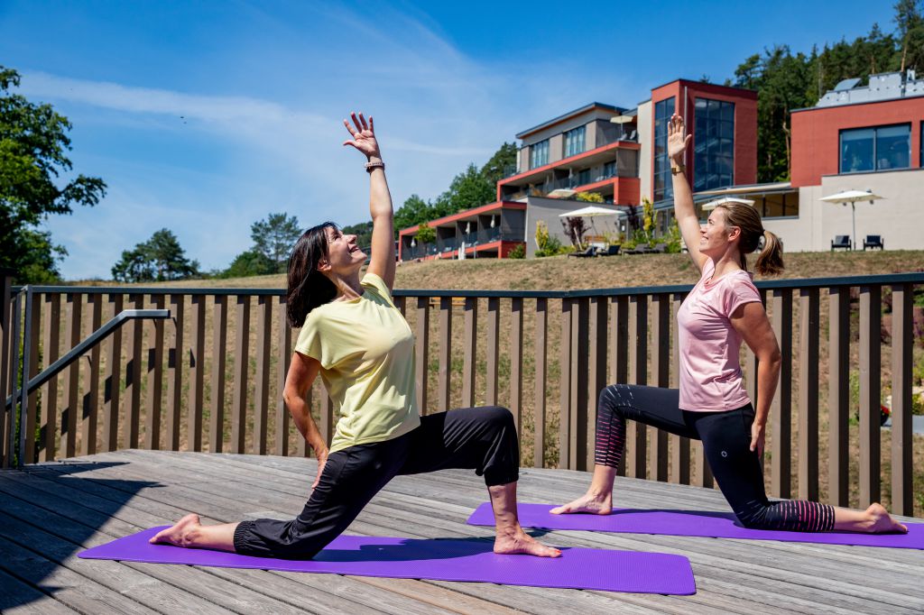 Gäste, die das Erholungsprogramm zwischen Naturschwimmteich, Yogaraum und Saunainsel buchen, nehmen während der Soul-Flow-Yoga Wochen an einem vielfältigen Kursangebot teil. Auf dem Tagesprogramm stehen unter anderem Yin-Yoga, Chakra-Klangschalenreisen, Yoga-Sequenzen, die speziell auf die Herzöffnung ausgerichtet sind, Faszien- sowie Wein-Yoga. Auch ein besonderes Aerial Yoga zum Schweben in Tüchern wird im neuen Yoga- und Bewegungsraum des Resorts angeboten. Für Abwechslung sorgen Wanderausflüge mit den ausgebildeten Yoga-Lehrerinnen entlang der Felsenarena auf dem Premiumwanderweg „Dahner Felsenpfad“. Dort lassen Naturliebhaber die Kraft des Pfälzerwaldes bei Mediationen und Atemübungen auf sich wirken. Zwischen den aktiven Einheiten genießen sie erholsame Momente im 55.000 Quadratmeter großen Gartenparadies, Aufgüsse in verschiedenen Saunen, baden im Infinitypool „Sprudelwoog“ mit Blick auf den Pfälzerwald und lassen sich mit edlen Tropfen aus der Vinothek sowie mit vielseitigen Gerichten aus der Küche des Hauses verwöhnen.