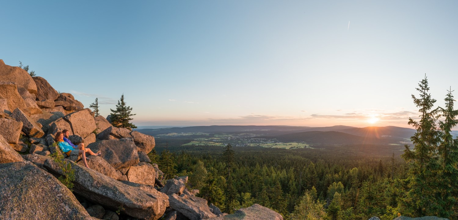 Geografen beschreiben die Landschaft des Fichtelgebirges gern als „Steinernes Hufeisen“. Die Höhenzüge aus Granit bilden zusammen tatsächlich die Form eines Hufeisens, das nach Nordosten geöffnet ist. Rund 40 Prozent der Fläche des Fichtelgebirges besteht aus Granit. So auch das Bergmassiv Kösseine, das mit einer grandiosen Aussicht und dem von nahezu allen Seiten sichtbaren Doppelgipfel beeindruckt. Im Gipfelbereich der Großen Kösseine befindet sich ein weitläufiges und unter Naturschutz stehendes Blockmeer. www.fichtelgebirge.bayern
