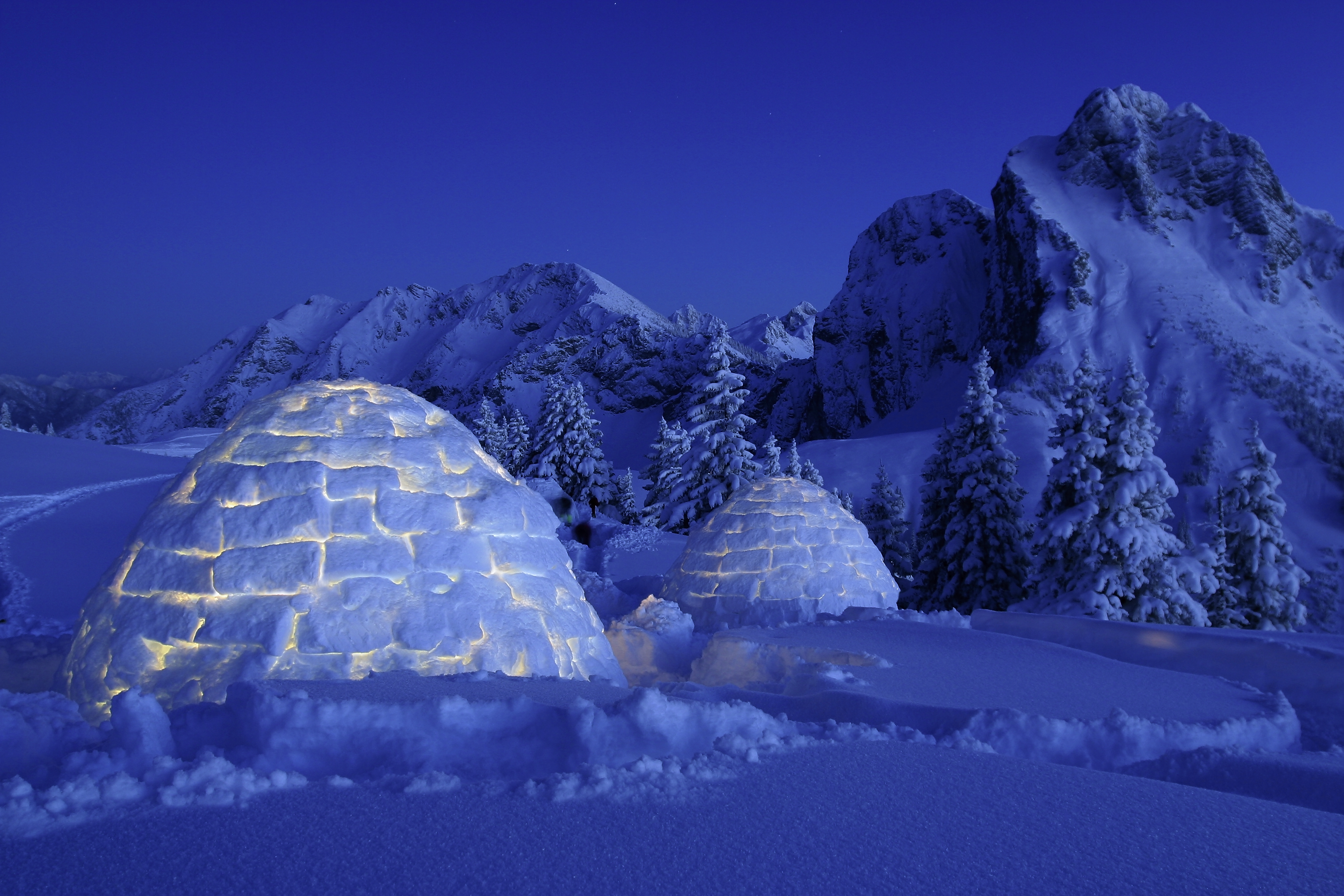 Für abenteuerliche Winterfans geht es in Pfronten zunächst mit der Bahn hoch hinauf auf das Plateau des Breitenbergs, wo sie anschließend in Begleitung von fachkundigen Guides und mit Schneeschuhen ausgerüstet einen geeigneten Platz zum Schlafen suchen. Genächtigt wird wie die Naturvölker in den polaren Gebieten inmitten von Schnee und Eis in Iglus. Für den Bau der Schlafstätte packen alle gemeinsam an. Nach einer ausführlichen Einweisung werden aus dem tiefen Schnee quaderförmige Bausteine herausgesägt und zu kuppelförmigen Schneehäusern zusammengebaut. Ausgestattet mit warmen Getränken, einer Isomatte, einem dicken Winter-Schlafsack sowie einer Kerze, wird es in der Behausung trotz frischer drei Grad im Inneren schön kuschelig. Bevor die abenteuerliche Nacht beginnt, geht es zum Sonnenuntergang für ein gemeinsames Abendessen noch in die nahegelegene Ostlerhütte.