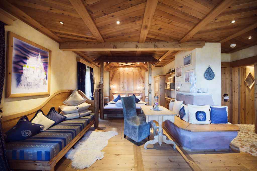 Sich einmal wie ein wahrer Märchenkönig fühlen, das können Gäste auf dem 1.250 Meter hohen Falkenstein, wo die höchste Burgruine Deutschlands thront. Wo einst König Ludwig II. von seinem letzten Projekt eines Traumschlosses träumte, fühlen sich heutzutage Gäste in dem etwas unterhalb gelegenen Boutiquehotel, der Blauen Burg, in den gemütlich Betten der insgesamt 17 Themenzimmer wohl. Die modern-elegant eingerichteten Zimmer „Burgkristall“, „Gipfelstürmer“, „Schatzkisterl“ und „Bergluft“ beispielsweise warten mit heimischen Hölzern, edlen Textilien und nachhaltige Materialien auf Übernachtungsgäste, während Chefkoch Simon Schlachter diese mit seiner ausgezeichneten Sterneküche verwöhnt.