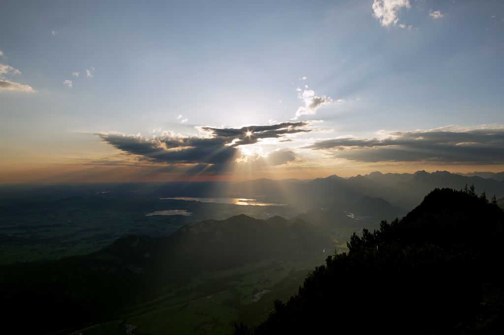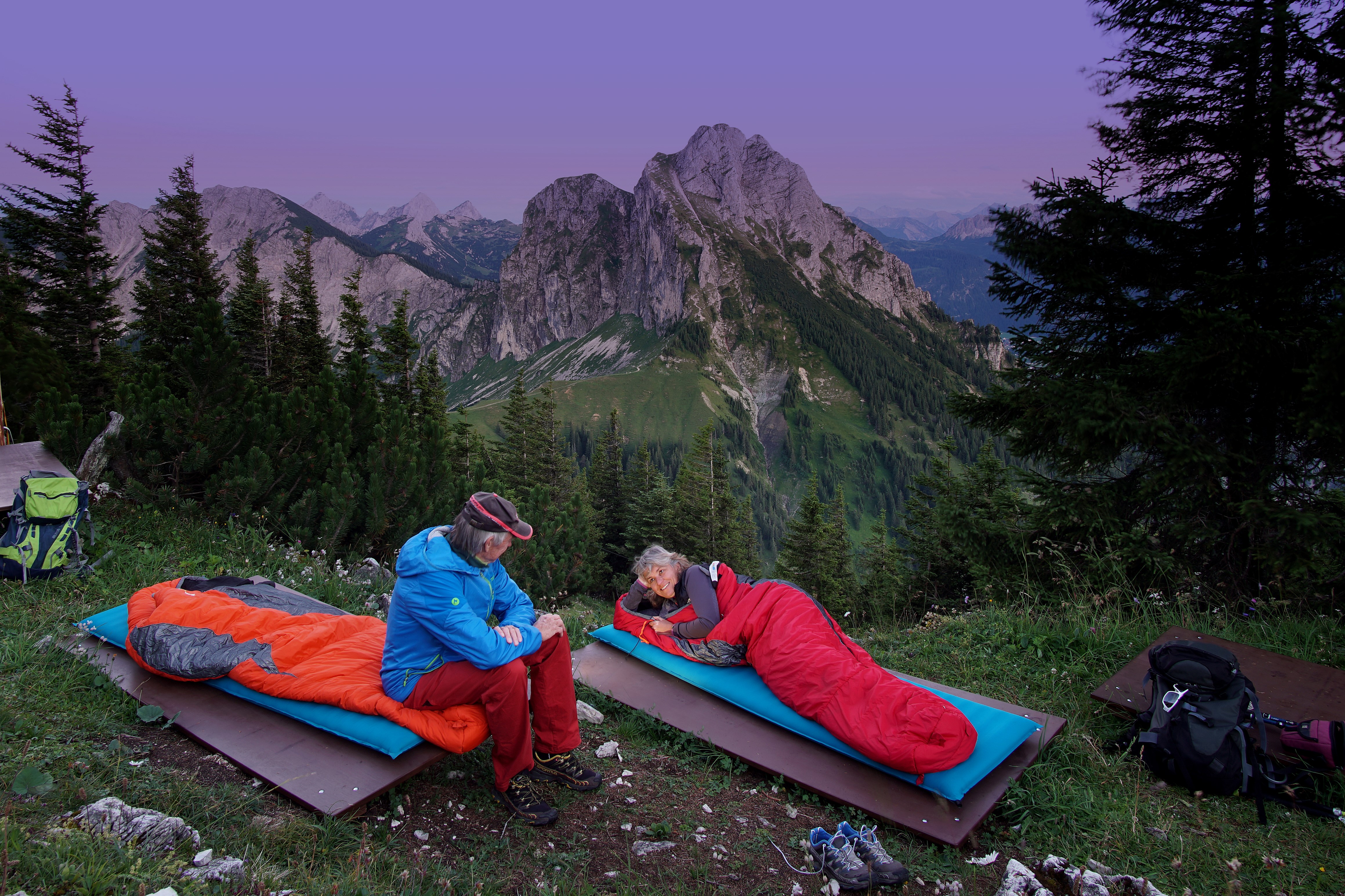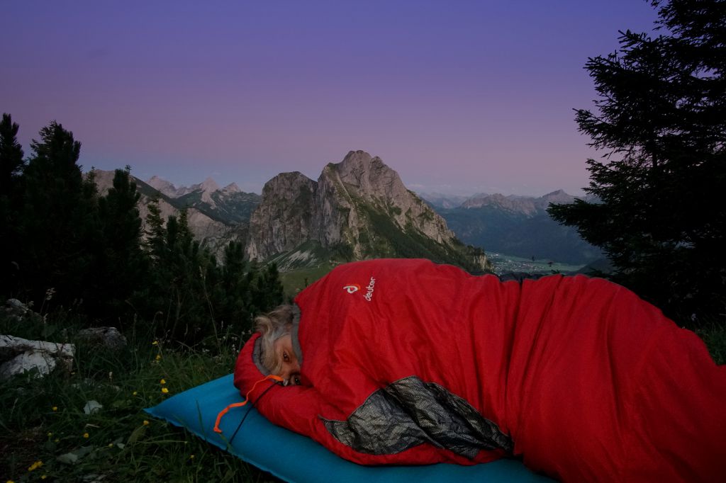 Ihr Lager für die Nacht errichten sich die Bergfreunde unweit der Hütte inmitten der alpinen Natur. Somit nutzen Teilnehmer den Komfort aller Annehmlichkeiten der Zivilisation und auch bei plötzlichem Wetterumschwung ist jederzeit eine Zufluchtmöglichkeit gegeben. Mit traditionellen Brotzeiten und Allgäuer Schmankerln lassen sie sich auf der „Hütte mit Herz“ verwöhnen und genießen das rote Farbenspiel des Sonnenuntergangs, das die Gipfel sprichwörtlich glühen lässt. Wenn sich die Nacht dann über die Bergwelt legt, kommen die ersten Sterne zum Vorschein. Mit Blick in die Alpen bis auf die Zugspitze und den umliegenden Dreitausendern erstreckt sich die unendlich groß erscheinende Milchstraße über dem markanten Aggenstein. Unter dem funkelnden Firmament schlafen die Abenteurer eingekuschelt im warmen Schlafsack.