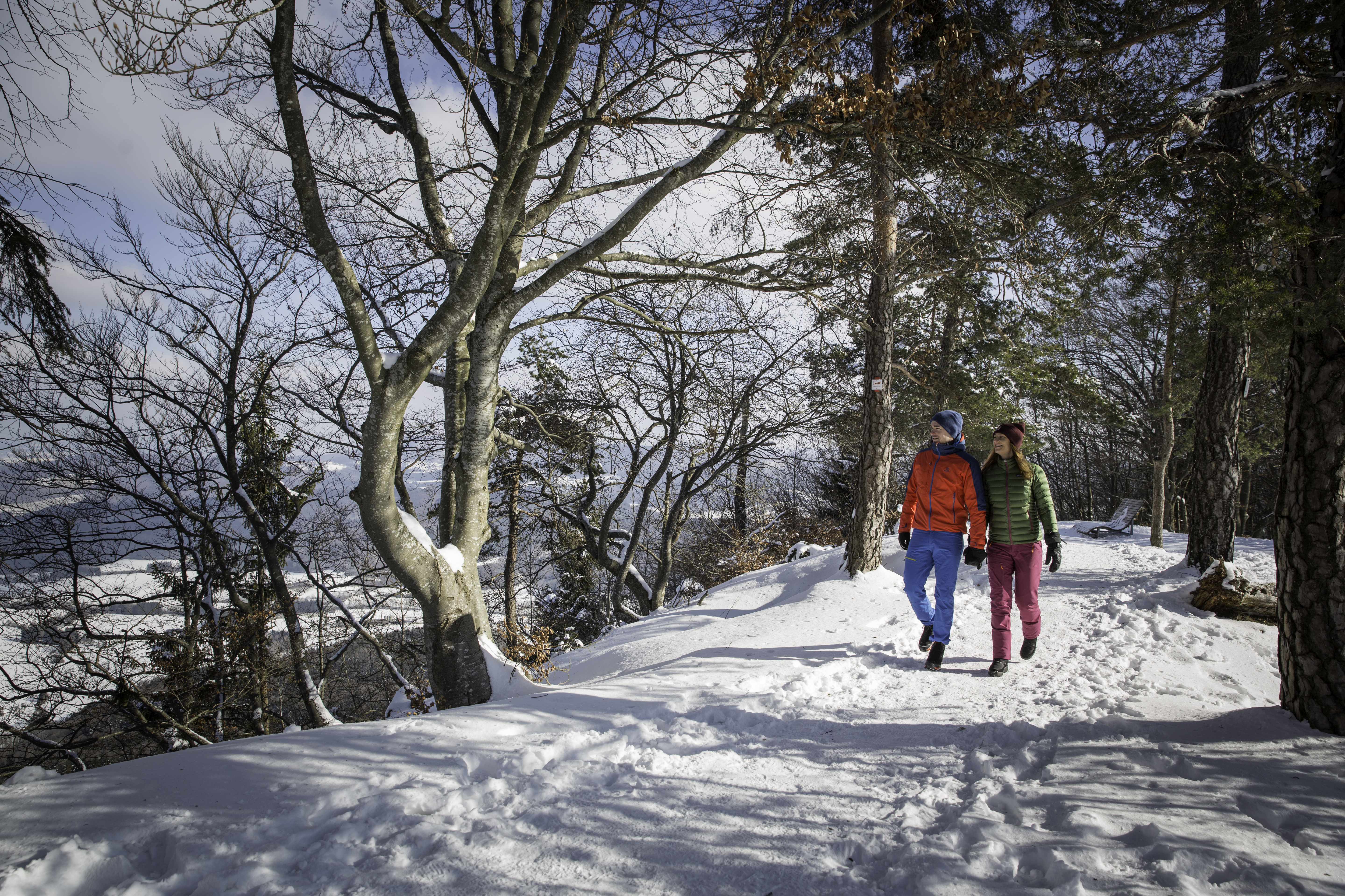 Hier erhebt sich bis auf 1.000 Meter die 200 Kilometer lange Felskante des Albtraufs, die das raue Hochplateau vom sanften Albvorland trennt. Wo im Sommer bunte Blumenwiesen und Wachholderheiden die Kulisse schmücken, führen ab einer Schneehöhe von 25 Zentimetern gesondert gekennzeichnete Wanderwege über die Hochplateaus. Auf den beiden vom Deutschen Wanderinstitut ausgezeichneten Premium-Winterwanderwegen „Wintermärchen“ und „Schneewalzer“ geht es gemütlich über die weißbedeckte Heidelandschaft, vorbei an schneebeladenen Tannen und entlang der beeindruckenden Traufkante. Von dort genießen Wanderer die winterlichen Postkarten-Ausblicke auf die imposante Burg Hohenzollern oder das Alpenvorland.