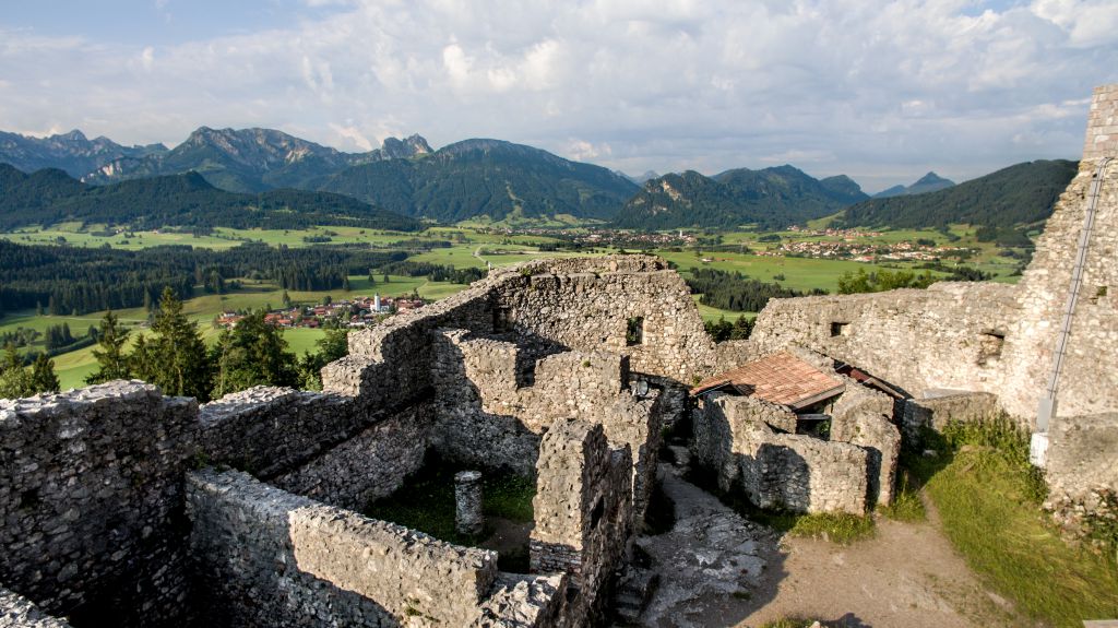 Von der auf 1.277 Meter gelegenen Burgruine Falkenstein, Deutschlands höchstgelegener Burganlage, erwartet Besucher ein spektakulärer 360-Grad-Panoramaausblick auf das Allgäuer Alpenvorland und die Gipfel von Aggenstein, Alpspitz und Co. Selbst Ludwig II. kam bei dem Anblick einst ins Träumen und plante hier auf den Mauern einer hochmittelalterlichen Burganlage sein letztes Schloss – ein kleiner Ausstellungsraum informiert über das gescheiterte Vorhaben. Urlauber bewundern die heutige Burgruine auf der „Königstraum - Rundwanderung um den Falkenstein" oder begeben sich auf eine E-Bike-Tour auf König Ludwigs Spuren. Die Burgruine Falkenstein sehen Besucher nicht nur von Pfronten oder vom Hausberg Breitenberg aus, sondern auch von den markanten Zwillingsruinen Hohenfreyberg und Eisenberg, die auf dem Rücken einer bewaldeten Anhöhe in der Nähe thronen. Auf der Halbtageswanderung Drachenblick kommen Wanderer an den Ruinen aus dem 15. Jahrhundert vorbei. Alternativ führt die rund einstündige Kleine Burgenrunde zu den imposantesten Burgelementen.