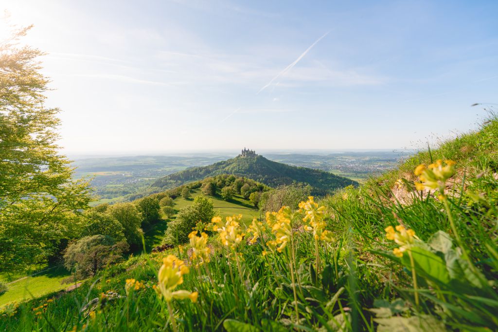 Sie ist der Hingucker der Zollernalb und ein echter Magnet für Urlauber: die Burg Hohenzollern. Wohl gebettet auf dem kegelförmigen Zollerberg auf rund 850 Metern Höhe lockt sie nicht nur zum Besuch, sondern auch mit einem prachtvollen Anblick von den Höhenwanderwegen der Outdoor-Destination Albstadt. Auf insgesamt elf vom Deutschen Wanderinstitut ausgezeichneten Premiumwegen, den sogenannten Traufgängen, können aktive Gäste die abwechslungsreiche Natur mit schroffen Felsformationen, ihren typischen Wacholderheiden und lichtdurchfluteten Buchenwäldern entdecken – oder eben einen Panoramablick auf die Burg Hohenzollern genießen. Diese war übrigens im Jahr 2015 Drehort des Hollywood-Thrillers „A Cure for Wellness“.